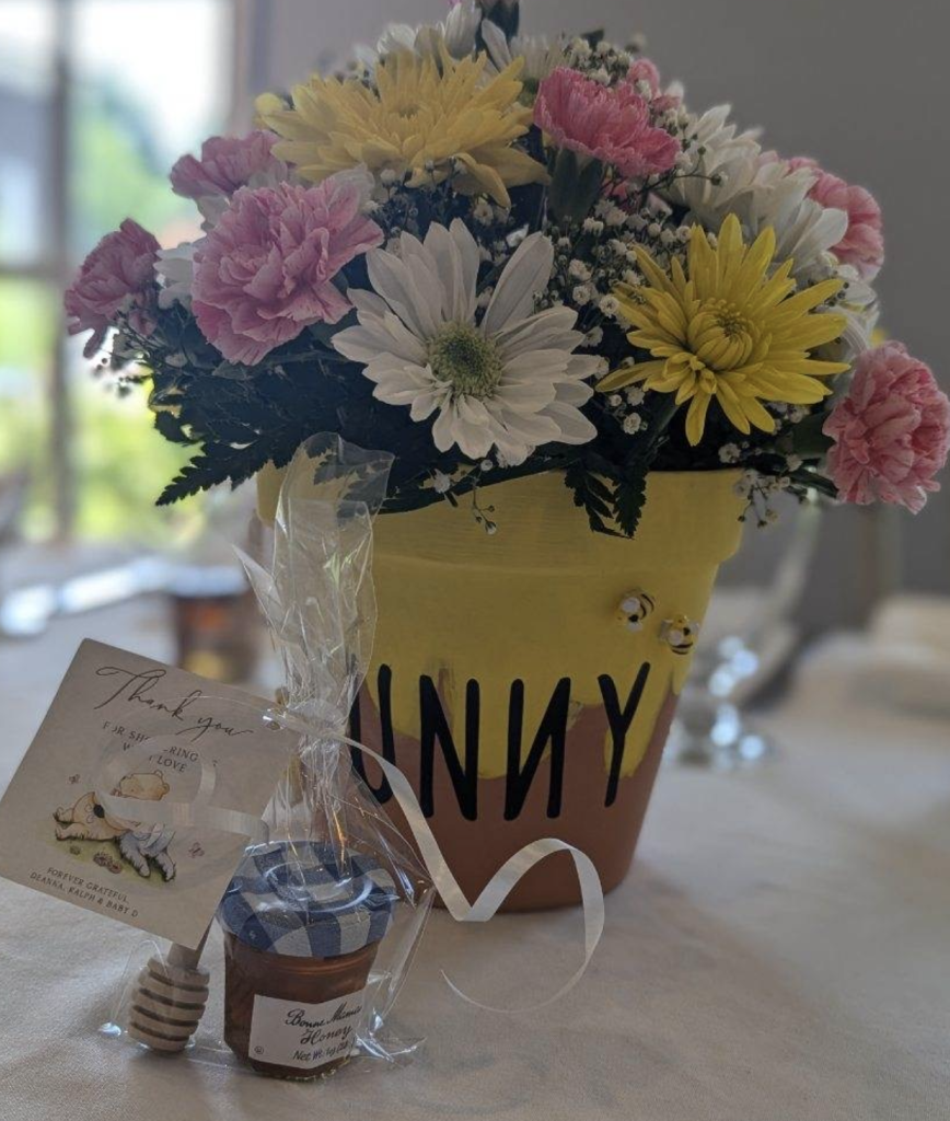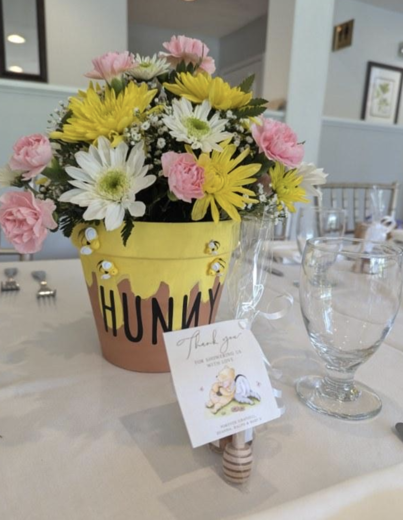 The table centerpieces were flower pots decorated as honey jars for a beautiful added touch.